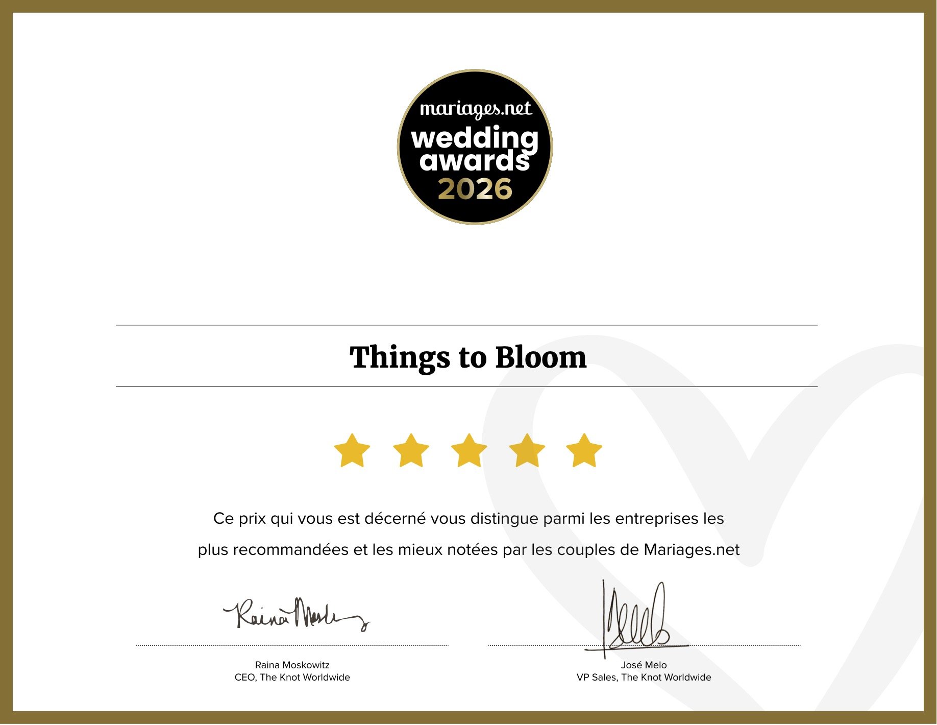 Wedding Awards 2021, 2022, 2023, 2024, 2025, 2026 - nous les avons mérités! Grâce à vos avis, Things to Bloom, fleuriste décorateur des mariages , a été élu meilleur professionnel du mariage trois fois de suite selon l’annuaire mariages.net.